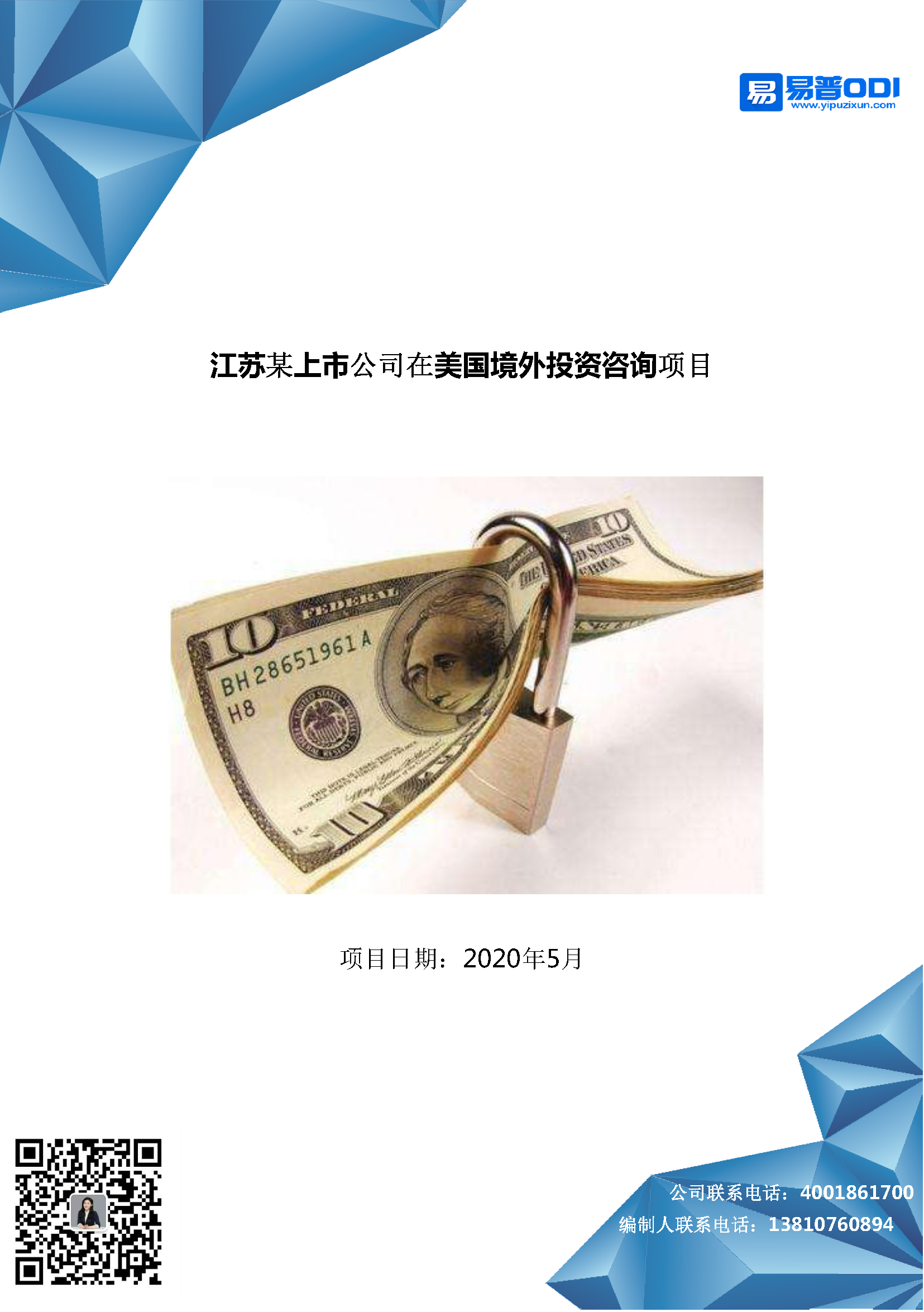 2020年3月易普咨询与江苏某上市公司签订境外投资咨询服务协议,帮助江苏某上市公司实现在美国地区的投资项目落地。